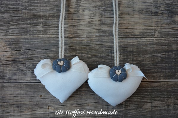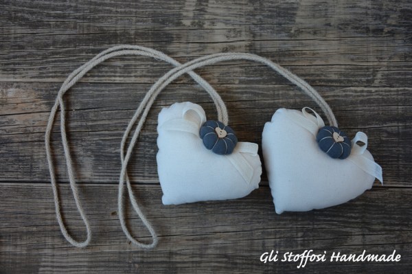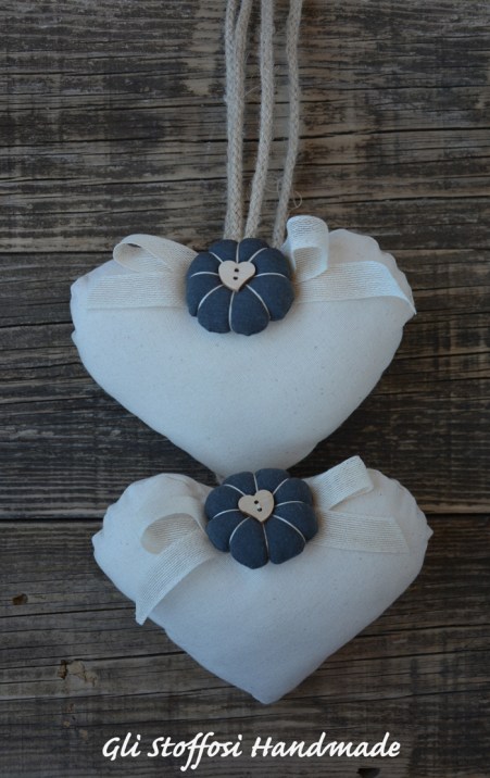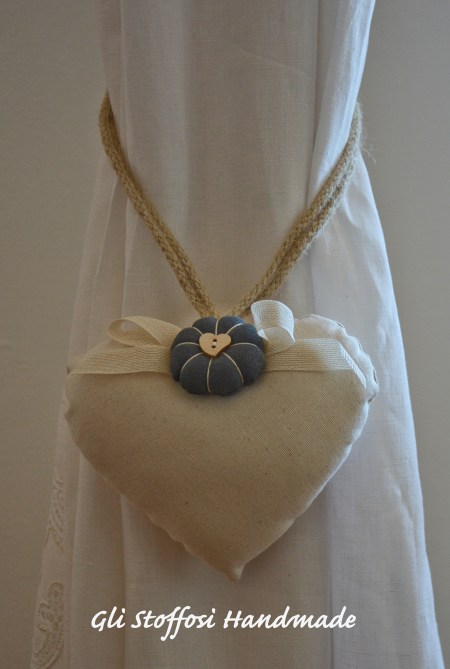 Il cuore è alto circa 16 cm ed è realizzato in tessuto color beige mentre il cordoncino, più scuro, in juta e lino, è lungo 60 cm, misura perfetta per avvolgere tende che hanno una larghezza che va dai 70 cm ai 2.5 mt. Si possono agganciare anche alle cerniere della finestra o porta-finestra. Puoi utilizzarli sia per le tende che per le calate della mantovana.