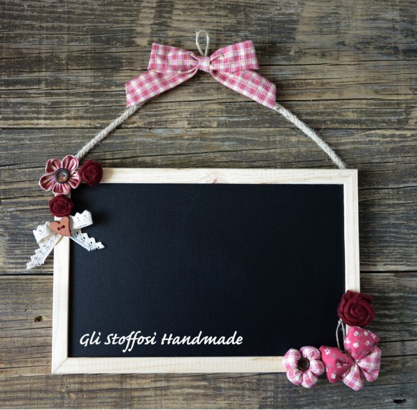 La LAVAGNETTA in legno è decorata con f fiocchetti, farfalla, fioori di stoffa, roselline in pannolenci, tutti realizzati interamente a mano. È un accessorio simpatico e molto utile in cucina. Ci puoi appuntare i vari impegni della giornata, utilizzandola a mo’ di agenda, segnare il menù, le cose da comprare, ma ci puoi scrivere anche una bellissima frase per augurare il buongiorno a tutta la famiglia e iniziare la giornata con una nota positiva.