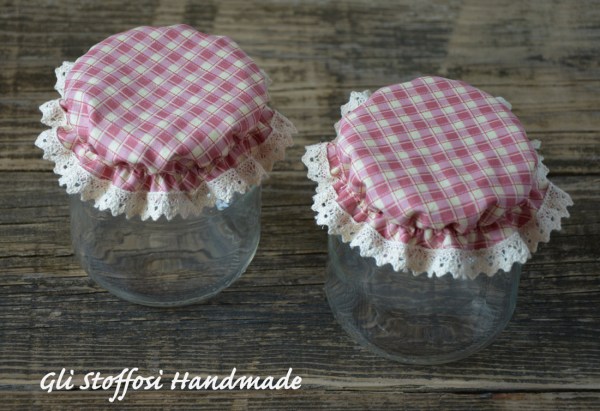 SET COPRIBARATTOLI realizzati in tessuto 100 % cotone, rifiniti con trina ecru, per i tuoi vasetti di conserve e marmellate. Molto carini e decorativi, da posizionare sulle mensole della cucina, perfetti per ricreare in cucina una atmosfera un po’ retrò.