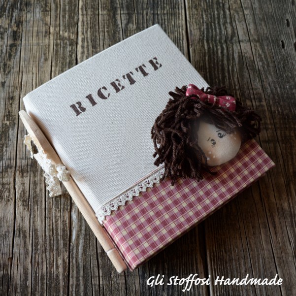 Il RICETTARIO è rivestito in tessuto anche all’interno, è ad anelli e contiene già 50 fogli a quadretti. (Misure ricettario 18 cm x 22 cm). La doll Lizzy con il suo dolce visetto è interamente fatta a mano e nasce dalla mia grande passione per lo stile country. Il mestolo, le trine e la scritta realizzata a stencil nascono dalla mia “mania” per la cura dei dettagli.