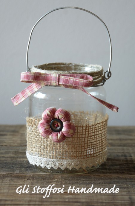 LANTERNA PORTACANDELE in vetro, con manico in fil di ferro, decorato a mano in stile country, rifinito con juta, trina, fiore in tessuto fatto a mano, e fiocchetto. Questa lanterna portacandele è ideale per creare un atmosfera particolare nei momenti di relax, molto bella anche come semplice decoro per la casa. Potrai inserirci candele profumate della fragranza che più ti piace. Potrai portarla anche in giardino o sul terrazzo e usarla con le candele antizanzare alla citronella, ma anche nel gazebo, per ricreare un’atmosfera romantica nelle calde serate estive.