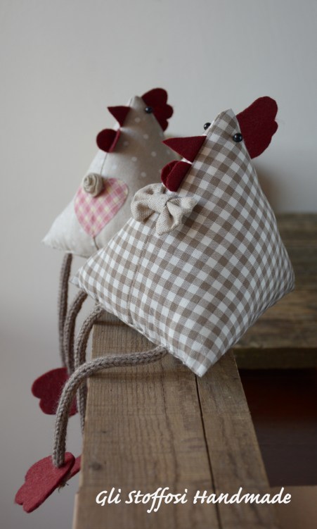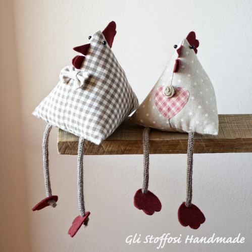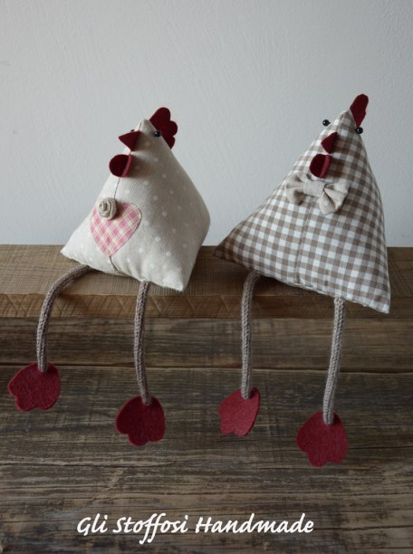 Coppia galletto e gallinella, in stile conutry chic – shabby chic, simpaticissimi da tenere sulle mensole della cucina o sulla libreria, con le gambe a penzoloni. Realizzati con tessuti di ottima qualità e rifiniti con cura in ogni dettaglio. Sono carini anche da regalare, un dono originale, fatto completamente a mano, sicuramente molto apprezzato da chi lo riceverà.