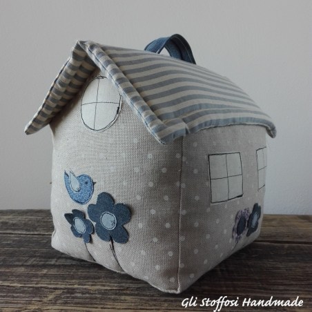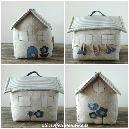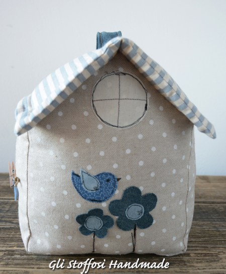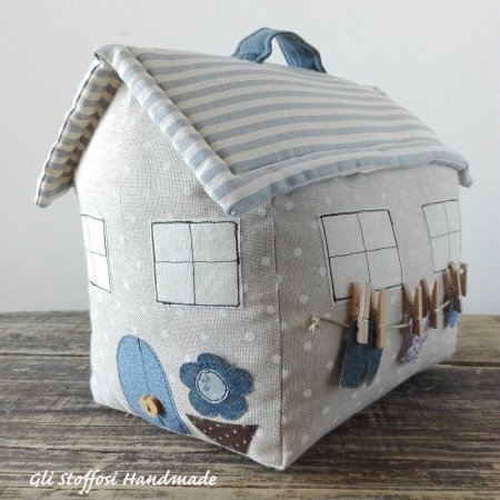 Casetta fermaporta realizzata in tessuto grezzo a pois e rifinita nei toni azzurro-blu, perfetta per tenere ferma la porta e elemento decorativo molto grazioso per la casa. Perfetta per chi ama curare i dettagli e arredare la casa con accessori particolari a originali .