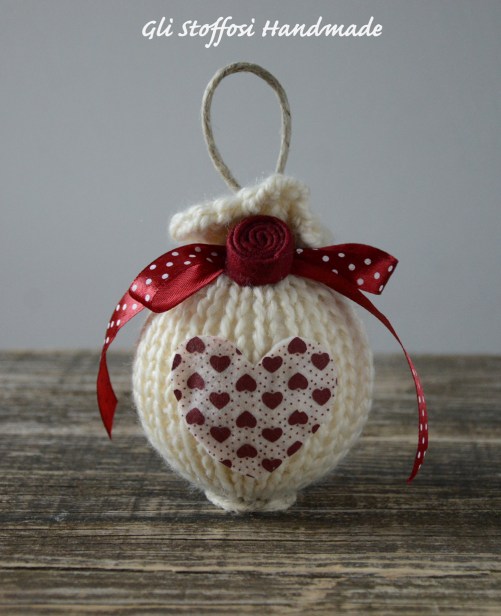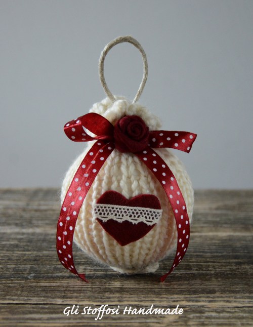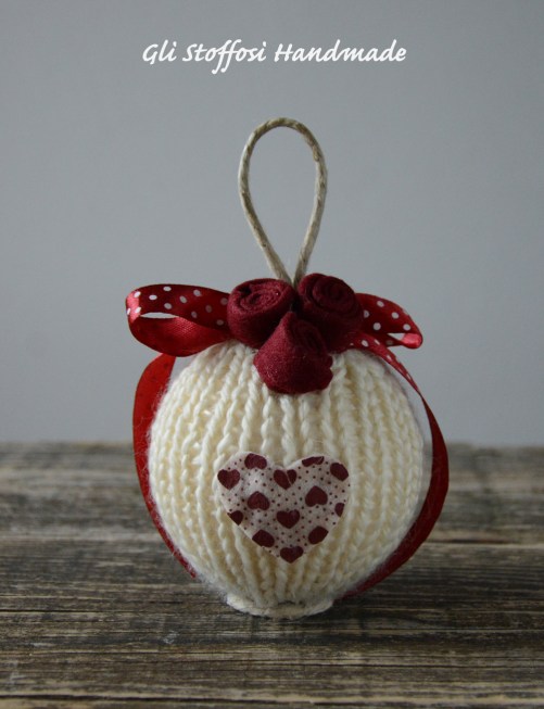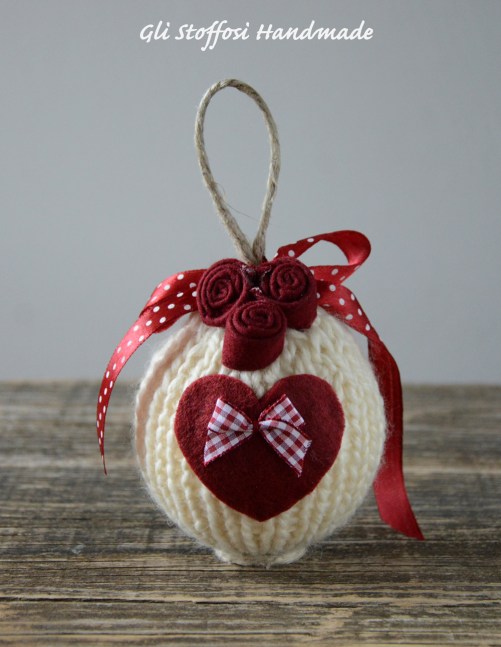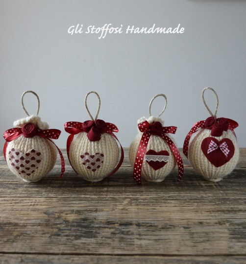 Set composto da 4 palline di Natale romantic chic, realizzate a mano con i ferri, rifinite con nastrini, pizzi, spago, roselline e cuoricini handmade in pannolenci.