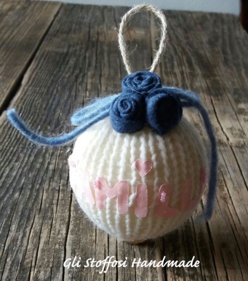 Pallina di Natale di lana, color panna decorata in blu e cartazucchero, in stile country chic, realizzata a maglia, con nome scritto in tessuto rosa e perline, decorata con roselline handmade in pannolenci.