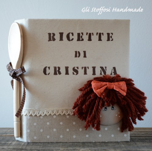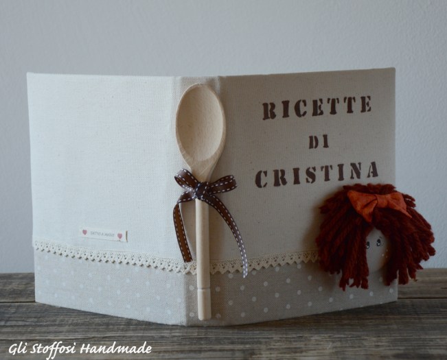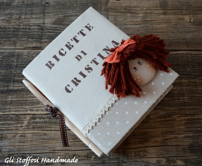 Quaderno delle ricette in stile country chic, realizzato con tessuto a pois ecru-panna in cotone e tessuto panna in cotone-lino di ottima qualità, e rifinito con trina grezza, doll realizzata interamente a mano curando ogni minimo dettaglio.