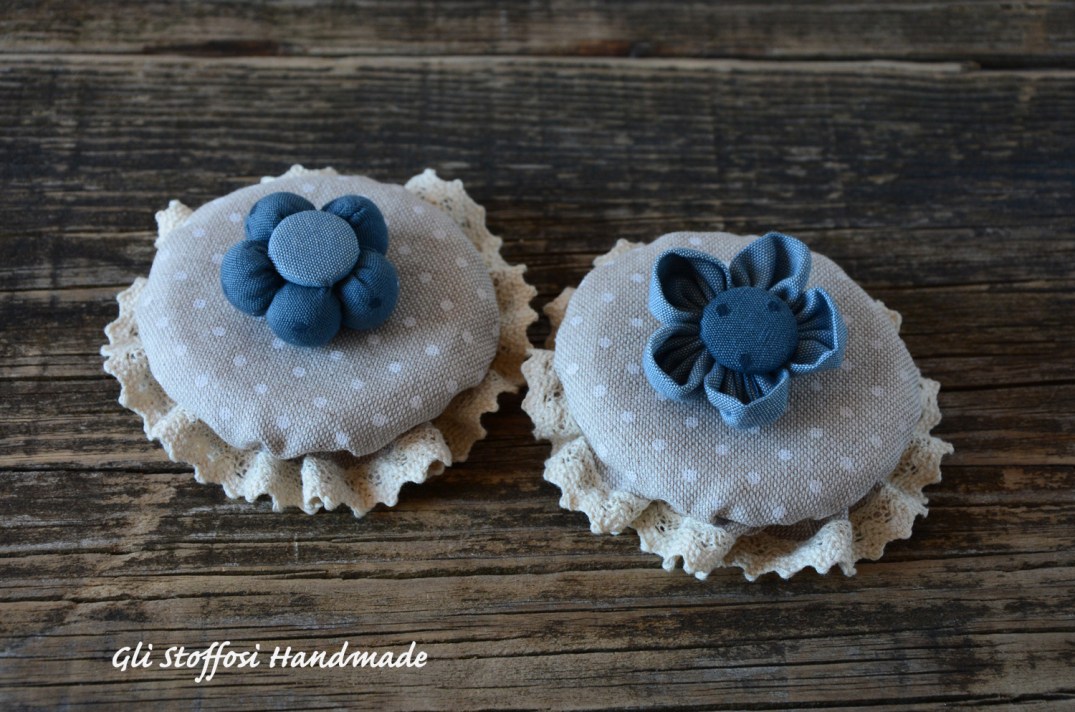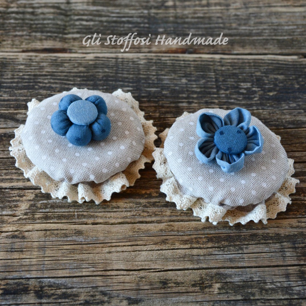 Copribarattoli in stile country chic-shabby chic, perfetti per ricoprire barattoli dal diametro 7-10 cm. Ideali da regalare a chi ama il country chic e lo shabby, sono deliziosi da posizionare sulle mensole della cucina, applicati sopra ai barattoli di confetture, conserve o sott’oli. Realizzati in tessuto di cotone, i fiorellini sono interamente fati a mano e sono removibili.