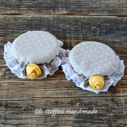 I copribarattoli sono un’idea originale per decorare i barattolini di miele o confettura da utilizzare come bomboniere per matrimonio, battesimo, prima comunione o cresima