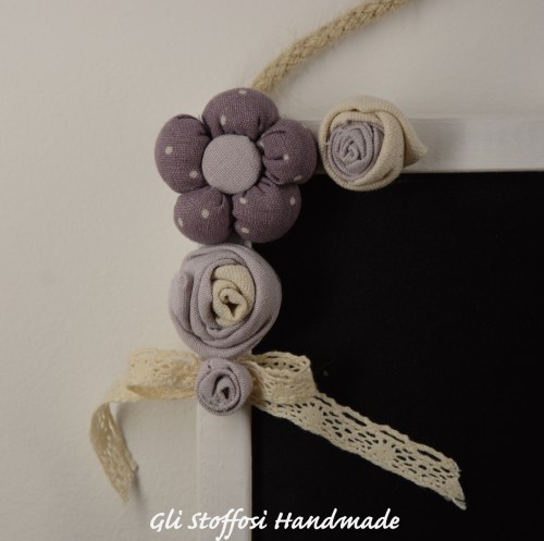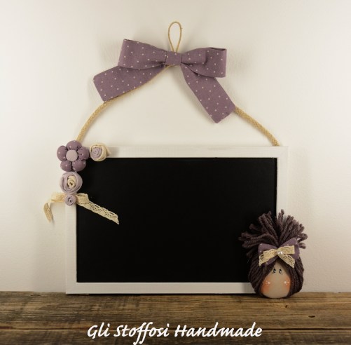 Lavagnetta in stile Country-Provanzale, decorata con country doll e fiorellini interamente realizzati a mano e rifiniti in ogni particolare.