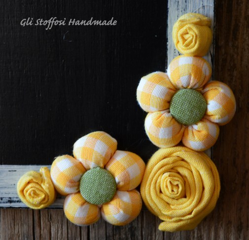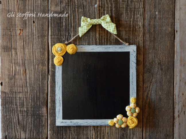 Lavagnetta in legno country style, realizzata completamente a mano e decorata con fiori e roselline in tessuto di cotone artigianale.