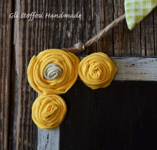 Lavagnetta in legno country style, realizzata completamente a mano e decorata con fiori e roselline in tessuto di cotone artigianale.
