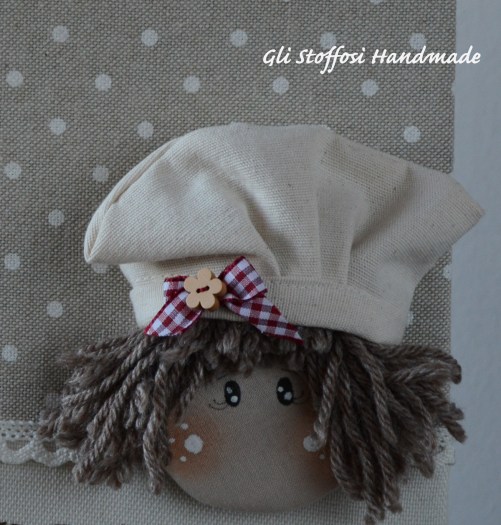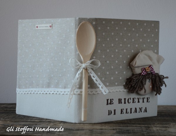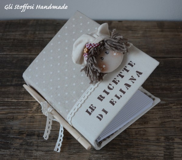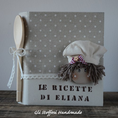 Quaderno delle ricette in stile country chic ideato per Eliana, realizzato con tessuto ecru a pois in misto lino e tessuto panna in cotone-lino, entrambi di ottima qualità; la doll-chef è realizzata interamente a mano curando ogni minimo particolare.