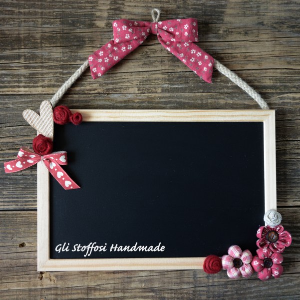 La LAVAGNETTA in legno è decorata con fiori in stoffa e roselline realizzati interamente a mano. È un accessorio simpatico e molto utile in cucina. Ci puoi appuntare i vari impegni della giornata, utilizzandola a mo’ di agenda, segnare il menù, le cose da comprare, ma ci puoi scrivere anche una bellissima frase per augurare il buongiorno a tutta la famiglia e iniziare la giornata con una nota positiva.