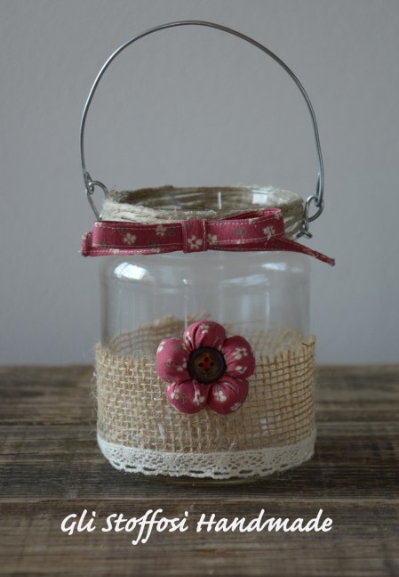 LANTERNA PORTACANDELE in vetro, con manico in fil di ferro, decorato a mano in stile country, rifinito con juta, trina, fiore in tessuto, fatto a mano e fiocchetto. Questa lanterna portacandele è ideale per creare un atmosfera particolare nei momenti di relax, molto bella anche come semplice decoro per la casa. Potrai inserirci candele profumate della fragranza che più ti piace. Può essere utilizzata anche come lanterna da in giardino, per il gazebo, per ricreare un’atmosfera country all’aria aperta, e goderti le belle giornate di sole o un’atmosfera a lume di candela nelle calde serate estive.