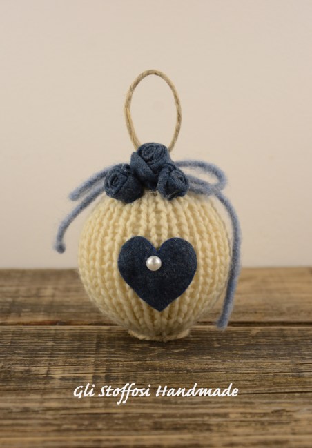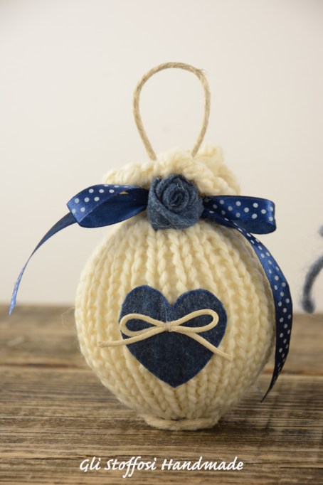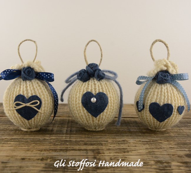Tris di palline di Natale color panna decorate in blu e cartazucchero, in stile country chic, realizzate a maglia, rifinite con nastrini, pizzi, spago, decorate con roselline e cuoricini handmade in pannolenci.